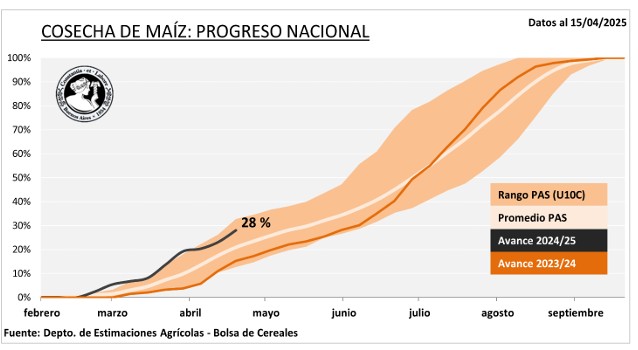 Asimismo, la cosecha de maíz con destino a grano comercial avanzó 4,9 p.p. durante la última semana, alcanzando el 28 % de las 7,1 MHa estimadas para la campaña en curso, con un rendimiento promedio nacional de 82,6 qq/Ha.