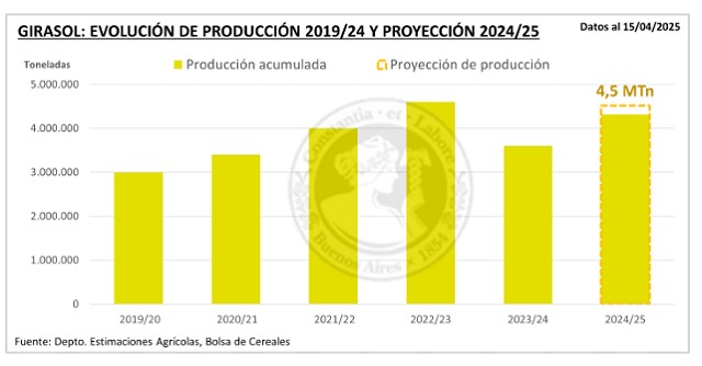 Finalmente, la cosecha de girasol entra en su etapa cúlmine y alcanza el 94,9 % del área apta, tras un progreso intersemanal de 7,3 p.p. El rinde promedio nacional se mantiene estable en 23,4 qq/Ha, consolidando la actual proyección de producción en 4,5 MTn. A la fecha, se da por finalizada la recolección en las regiones Sur de Córdoba, San Luis y Centro de Buenos Aires, si bien aún restan algunos lotes puntuales que no modificarían la actual estimación, con rendimientos entre un 7 y un 12 % por encima del promedio de las últimas 10 campañas. El área remanente se concentra exclusivamente en el sur de Buenos Aires y La Pampa, a la espera de condiciones adecuadas para cosechar, donde los rendimientos continúan siendo alentadores a pesar de los excesos hídricos registrados desde marzo. Con estos resultados, el ciclo 2024/25 se encamina a alcanzar el segundo volumen de producción más alto de la serie PAS.