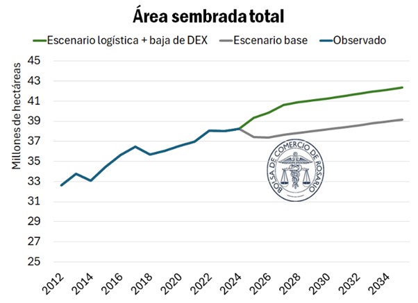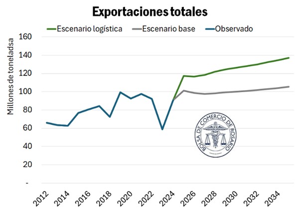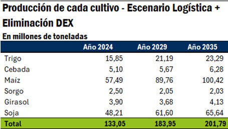 La producción total proyectada para 2035, bajo el escenario que combina mejoras logísticas y la eliminación de los derechos de exportación, alcanza los 202 millones de toneladas (Mt), lo que implica un crecimiento del 26,7% en relación con los 159,3 Mt del escenario base.