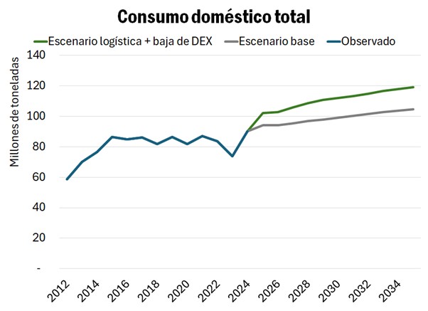 En el escenario de mejora de infraestructura y logística y eliminación gradual de derechos de exportación, el uso doméstico total proyectado para el año 2035 sube hasta a los 119 millones de toneladas (+13,8% con relación al escenario base). El uso doméstico de trigo se mantiene en 7,67 Mt (+0,0%), al igual que el de cebada, con 2 Mt (+0,4%), y maíz, con 37,86 Mt (+0,0%). El uso del sorgo cae levemente a 1,3 Mt (-10,8%) mientras el girasol se mantiene en 4,1 Mt (-0,4%). Finalmente, por el lado de los granos, el consumo interno de soja crece de la mano de una mayor industrialización por la mayor oferta a 58,78 Mt (+7,8%).