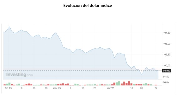 A partir de la nueva este cuadro, sobre todo de la cuestión arancelaria, el dólar ha comenzado un recorrido a la baja en relación a las demás monedas del mundo.