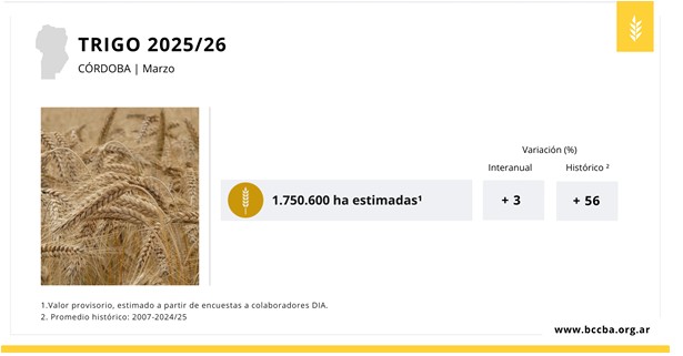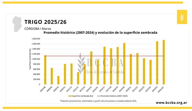 En marzo, la intención de siembra de trigo para la campaña 2025/26 muestra un aumento del 3% en la superficie a sembrarse respecto a la campaña anterior, esta diferencia equivale aproximadamente a 50 mil hectáreas. Los departamentos con mayor superficie sembrada serían San Justo, Unión y General Roca.