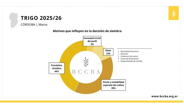Según los datos de los colaboradores del DIA, el principal factor que influyó en la decisión de siembra fue el climático. En segundo lugar, se mencionan factores económicos, a pesar de que los márgenes para el cereal serían más ajustados respecto al ciclo previo. Otros factores relevantes incluyen la rotación de cultivos, la necesidad de cobertura del suelo, las necesidades financieras y el costo de los fertilizantes. Según los registros de las lluvias acumuladas del mes de marzo, todos los departamentos superaron los promedios históricos esperados para la época e incrementaron la humedad del suelo, lo que podría traducirse en una variación de la intención de siembra en próximos informes.