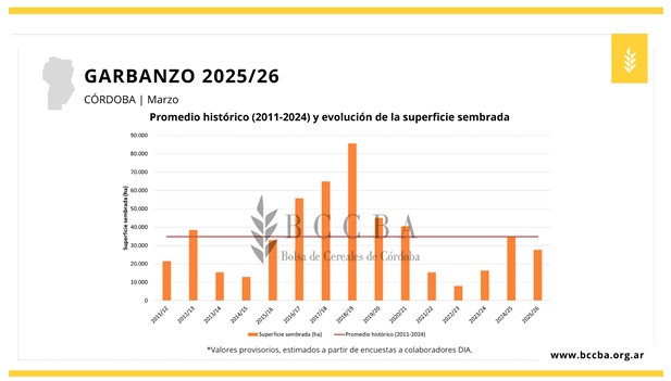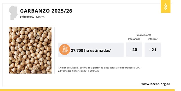 En cuanto al garbanzo, el área sembrada sufriría una disminución del 20% en comparación con la campaña anterior. Los departamentos con mayor proyección de siembra serían Totoral, Río Primero y Colón respectivamente.