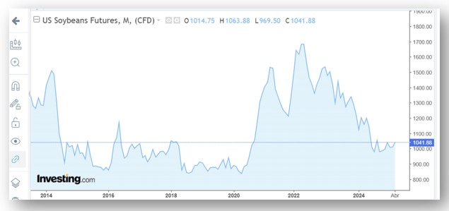 El gráfico muestra el recorrido de la soja de los últimos diez años.