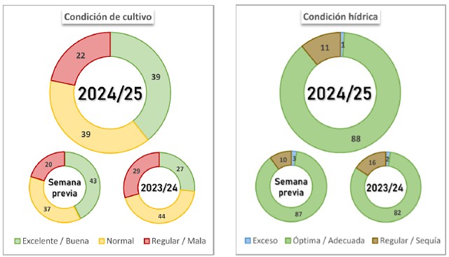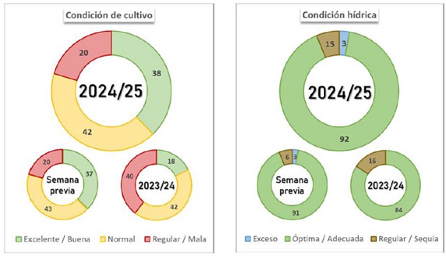 Por su parte, el 61 % de la soja de segunda ha alcanzado la madurez fisiológica, y el 79,7 % de los lotes se encuentraen condición Normal a Excelente. Los primeros lotes recolectados en el Núcleo Norte han superado las expectativasde rendimiento. En este contexto, se mantiene la proyección de producción en 48,6 millones de toneladas.