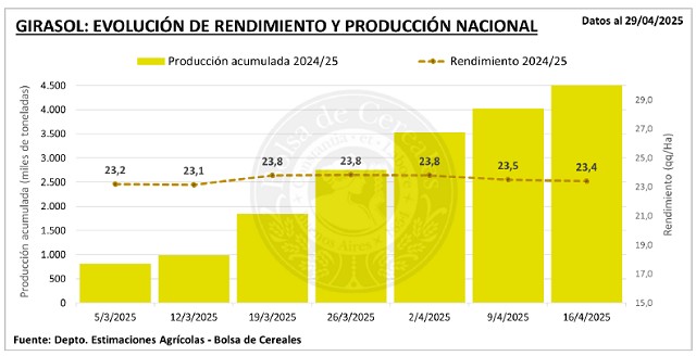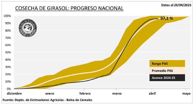Con un progreso intersemanal de 0,8 p.p. la cosecha avanzósobre el 97,1 % del área apta. El rinde promedio nacional seposiciona en 23,4 qq/Ha y la proyección de producción sesostiene en 4,7 MTn.