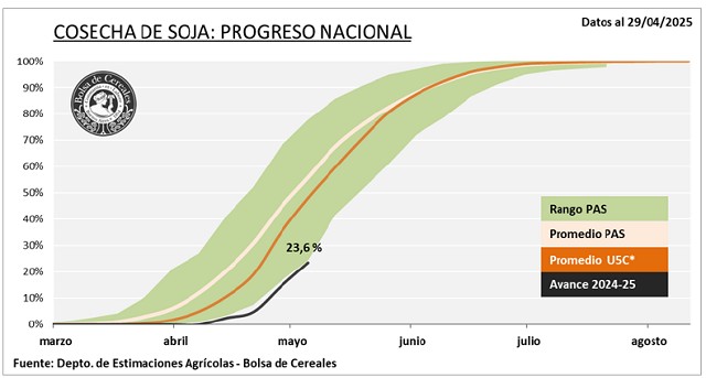 La cosecha de soja avanza sobre el 23,6 % del área apta anivel nacional, con un rendimiento promedio de 33 qq/Ha yrindes superiores a los iniciales en soja de primera. Sesostiene la proyección de producción en 48,6 MTn.