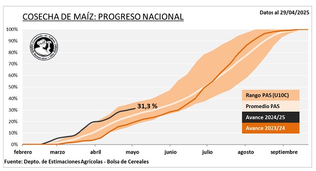 En lo que respecta a maíz con destino grano, la cosecha continúa avanzando lentamente dando prioridad a soja yesperando alcanzar humedad óptima sobre zonas del centro-sur bonaerense afectadas por excesos hídricos. A lafecha, se ha cosechado el 31,3 % del total nacional (+9,3 p.p. vs. ciclo anterior) con un rinde medio de 82,1 qq/Ha. Ala espera de que comience la recolección de los planteos tardíos, la cual se espera para mediados del mes de mayo,los rendimientos esperados se encuentran, a nivel general, en línea con lo proyectado, aunque con variacioneszonales. Se realizaron algunos ajustes a la baja en el norte del área agrícola, debido a la situación ya descripta en esazona durante los meses de verano que terminó afectando más que lo esperado a los cultivos.