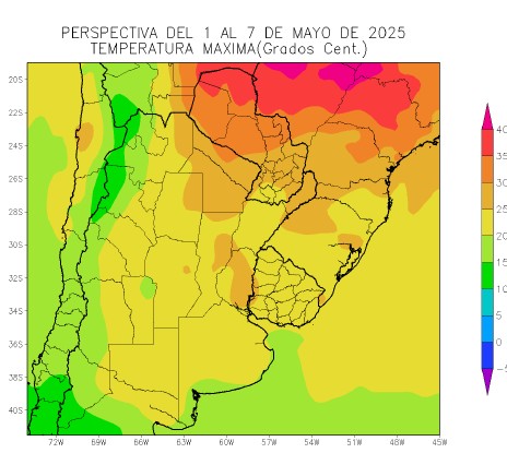 El este de Salta, la Región del Chaco, el sudeste del Paraguay, el norte y el sur de la Mesopotamia, el nordeste de la Región Pampeana y el sudoeste del Uruguay observarán temperaturas máximas superiores a 25°C, con un foco con temperaturas máximas superiores a 30°C, que se ubicará sobre la mayor parte del Paraguay y el norte de Formosa.