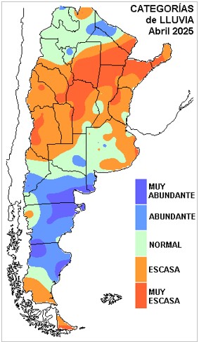 Como podemos ver en el mapa de categorías de lluvias, las deficiencias más marcadas se establecen en el noreste del país, extendiéndose a gran parte del norte cordobés, siendo el retroceso pluvial menos importante en el resto de las provincias del centro y el este bonaerense.