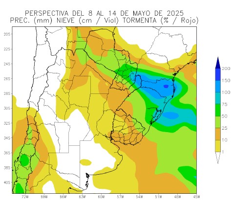 Al inicio de la perspectiva, se completará el paso del frente, que inició su recorrido al final de la etapa anterior, causando lluvias con su foco de mayor actividad sobre la Pcia de Misiones, y registros dispersos sobre la mayor parte del resto de su extensión, mientras la Cordillera Sur observará tormentas de moderada intensidad. Los vientos polares acompañarán el avance del frente, causando temperaturas mínimas bajo lo normal en la mayor parte del área agrícola, con heladas generales en las zonas serranas del oeste, y heladas localizadas en gran parte de la Región Pampeana y el Uruguay. Los vientos del trópico retornarán con moderado vigor, produciendo fuertes calores sobre el extremo norte del área agrícola, y registros más moderados, pero algo superiores a la media estacional sobre el centro, mientras el sur continuará bajo el dominio de los vientos polares, con registros bajo lo normal.