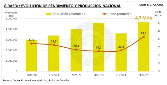En cuanto al girasol, pese que aún quedan algunos lotes en pie que no modificarían la actual estimación, damos por concluida la cosecha 2024/25, con la recolección del área remanente de Buenos Aires y La Pampa. Los resultados obtenidos en esta campaña posicionan el ciclo 2024/25 como el de mayor rendimiento (23,4 qq/Ha) y volumen producido (4,7 MTn) de la serie PAS, superando al promedio de las U5C en 12,8 y 26,3 %, respectivamente.