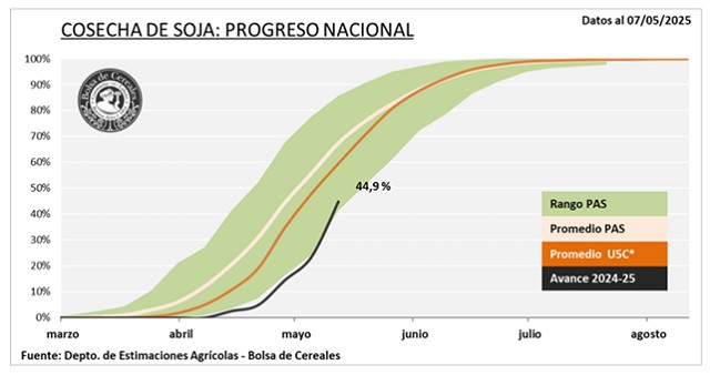 Luego de un avance intersemanal de 21 p.p. la cosecha de soja cubre el 44,9 % de la superficie apta a nivel nacional. Se ajusta nuestra proyección de producción en +1,4 MTn, llegando a las 50 MTn para la actual campaña.