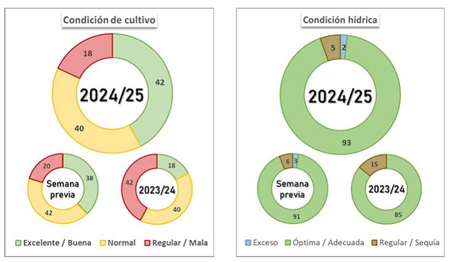 Luego de un progreso intersemanal de 2,9 p.p., finaliza la cosecha 2024/25, con un volumen total de 4,7 MTn, y un rinde promedio de 23,4 qq/Ha, ubicándose ambos valores como récords absolutos de la serie PAS.