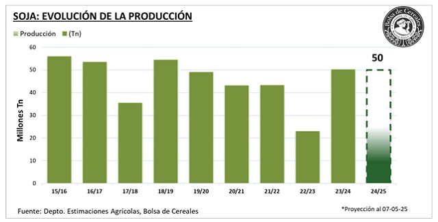 El rendimiento medio nacional se ubica en 32,4 qq/Ha, superando los 29,7 qq/Ha de la campaña 2023/24. Con el 53 % de la soja de primera recolectada, el rinde promedio es de 33,3 qq/Ha, destacándose resultados superiores a los inicialmente esperados en la provincia de Córdoba, ambos núcleos productivos y el Centro-Este de Entre Ríos, confirmando la tendencia al alza anticipada en informes anteriores. En cuanto a la soja de segunda, con un 21 % de avance de cosecha, los primeros lotes recolectados en ambos núcleos también muestran rendimientos por encima de lo previsto, al igual que en Entre Ríos y el Norte de La Pampa-Oeste de Buenos Aires. Bajo este contexto favorable, se ajusta la proyección de producción en + 1,4 MTn, alcanzando los 50 MTn para la campaña actual.