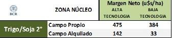 Los márgenes del cultivo trigo tienen una gran dependencia del nivel tecnológico que se aplique. Para entender los riesgos y beneficios del cultivo, hay que dar un paso más y hacer los números para al menos dos escenarios bien distintos entre:
