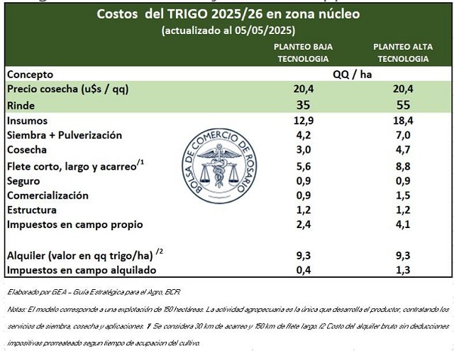 Con precios actualizados al 5 de mayo, en campo propio, el planteo de alta tecnología deja un margen de 171 u$s/ha. En campo alquilado, el resultado es de solo 40 u$s/ha. El rinde de indiferencia se ubica en 42 y 52 qq/ha (sin computar impuestos), respectivamente.