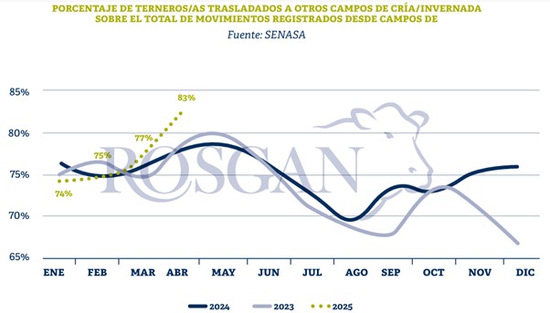 Es más, si analizamos estos mismos datos con una apertura mensual podemos observar un importante incremento de este porcentaje en el último mes, donde la proporción de traslados a otros campos llegó a representar el 83% de los movimientos totales contra el 78% y 79%, en los últimos dos abriles.