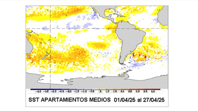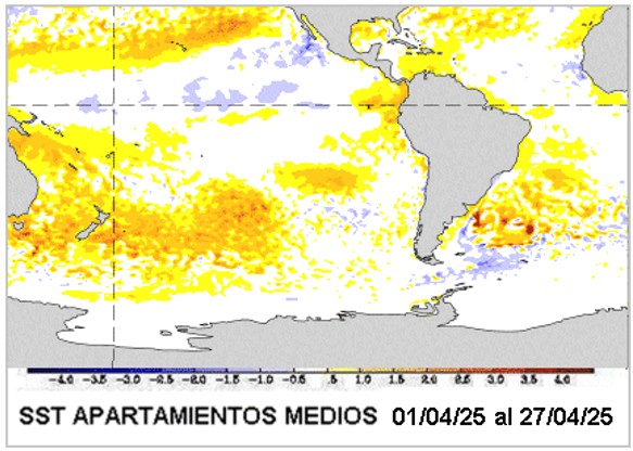 En el mapa que representa las anomalías de las temperaturas superficiales del océano podemos detectar dos cosas de interés para el sudeste de Sudamérica. En primer lugar, el Pacifico Ecuatorial central alterna enfriamientos débiles y calentamientos, los cuales no son consistentes con ninguna posición por fuera de la neutralidad. En segundo término, el litoral Atlántico sigue cálido, es decir, con buena circulación del noreste, seguirá siendo una fuente importante de masas de aire húmedo. Podríamos agregar también, que no se detectan mares sobreenfriados en forma significativa, con lo cual los enfriamientos fuertes deberán ser de origen polar, dado que los mares no están particularmente fríos. Igualmente comienza a notarse una influencia de la corriente oceánica de Malvinas transportando agua más fría hacia el norte.