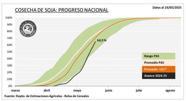 SOJA Con un progreso intersemanal de 20 p.p. la cosecha de soja cubre el 64,9 % del área apta a nivel nacional. El rinde medio se ubica en 32 qq/Ha. Sostenemos nuestra proyección de producción en 50 MTn.