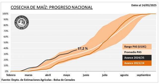 Durante la última semana, la cosecha de maíz con destino grano avanzó 2,3 puntos porcentuales, alcanzando el 37,2 % del área estimada a nivel nacional, con un rendimiento medio de 81,2 qq/Ha. Las labores se concentraron principalmente sobre lotes tempranos del sur del área agrícola, donde los rindes fueron en su mayoría buenos, aunque en algunos casos se observaron mermas asociadas al estrés térmico e hídrico registrado durante el verano. A la espera de que se generalicen las labores sobre los planteos tardíos en el centro del área agrícola, las primeras perspectivas para este segmento son favorables. En particular, en regiones como el Centro-Norte de Córdoba y el Núcleo Norte se prevé una recuperación significativa de los rindes en comparación con la campaña anterior, cuando estas zonas fueron severamente afectadas por la chicharrita. Sin embargo, este repunte en los rendimientos se ve contrarrestado por una marcada reducción del área implantada con maíz tardío en dichas regiones, lo que limita el crecimiento de la producción total. En este contexto, se mantiene la proyección nacional de producción de maíz en 49 MTn.