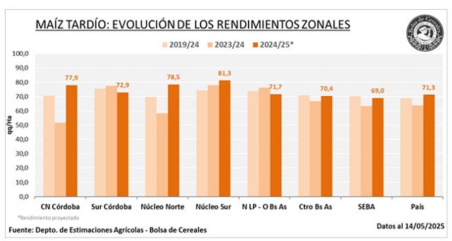 La cosecha de maíz avanza con buenos rindes en el sur. Mejora el maíz tardío en Córdoba y Núcleo Norte, pero la menor área limita la producción. Mantenemos nuestra proyección de producción en 49 MTn.