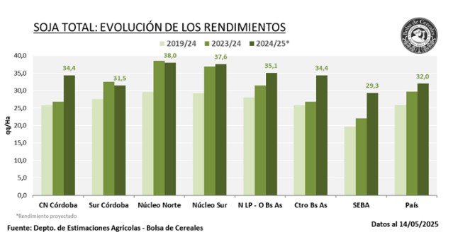 El rendimiento medio nacional se ubica en 32 qq/Ha, un 8 % por encima del ciclo previo. La recolección de los lotes de soja de primera alcanza el 73,6 % del área, con un rendimiento promedio de 32,6 qq/Ha, destacándose resultados superiores a lo esperado en la región central. En cuanto a la soja de segunda, el avance llega al 41,9 % de los lotes, con un rendimiento promedio de 26,6 qq/Ha. En el Núcleo Norte, con un progreso del 65 %, los rindes se consolidan promediando los 32,5 qq/Ha, con registros puntuales que igualan o incluso superan los obtenidos en soja de primera. En este contexto, se sostiene la proyección de producción nacional en 50 MTn.