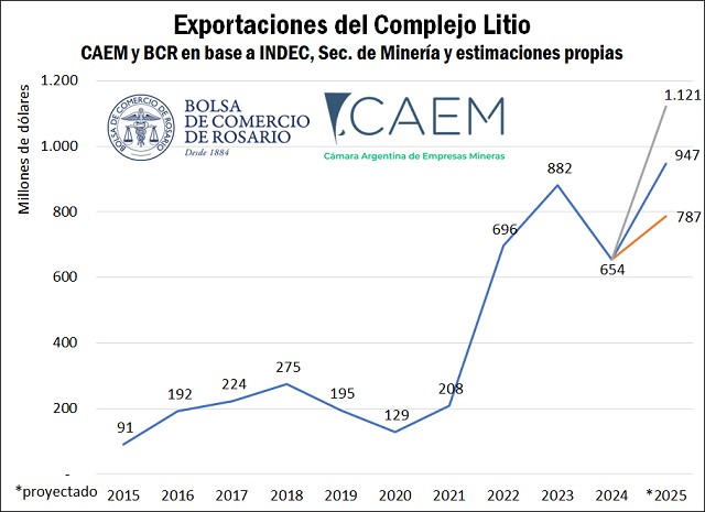 Con precios estabilizados en torno a los USD 8.500 por tonelada, y si se cumple el 85% de la expectativa productiva, el valor exportado por el Complejo Litio podría alcanzar los US$ 947 millones en 2025. Esto representaría un crecimiento del 44% en dólares respecto a los montos del 2024.