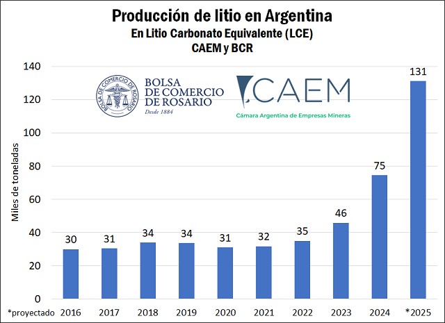 De acuerdo con las perspectivas de las principales mineras de litio del país, Argentina espera una producción nacional cercana a las 131.000 toneladas en 2025. Este volumen se compone en más de un 90% por carbonato de litio, y en menor medida por cloruro e hidróxido de litio.