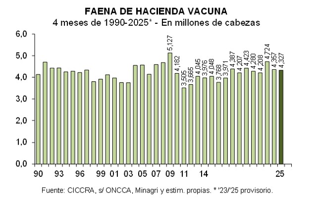 En el primer cuatrimestre de 2025 un total de 354 establecimientos frigoríficos faenaron 4,33 millones de cabezas, es decir 0,7% menos que en el mismo período del año pasado.
