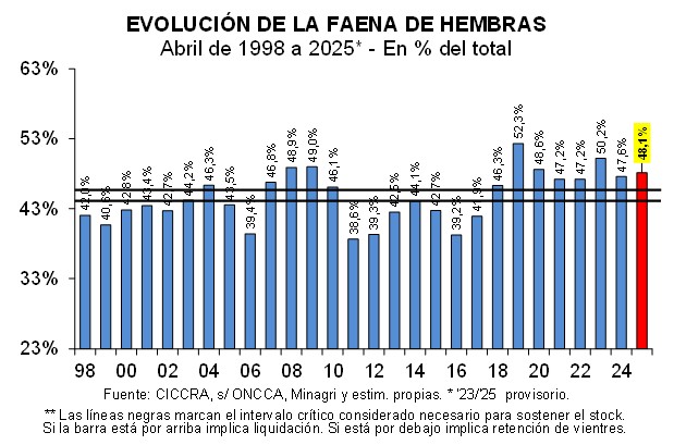 Asimismo, se faenaron 539,8 mil hembras en abril de 2025, lo que representó un incremento de 5,4% interanual. La faena de vaquillonas creció a mayor ritmo que la de vacas: 7,8% vs. 2,4% anual. En total se faenaron 305,48 mil vaquillonas (+22,04 mil cabezas) y 234,3 mil vacas (+5,39 mil cabezas). Con estos guarismos, la participación de las hembras en la faena total subió 0,55 puntos porcentuales con relación a abril del año pasado, hasta ubicarse en 48,1%. Si bien este ratio quedó muy por encima del límite superior del rango compatible con el sostenimiento del rodeo vacuno, es importante destacar que estuvo alcanzado por cuestiones estacionales.
