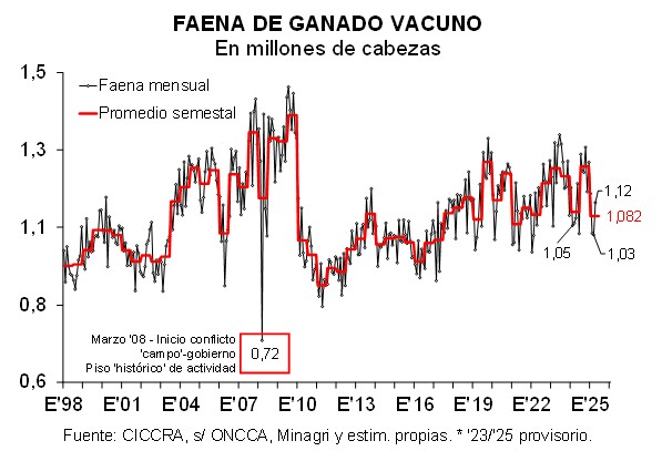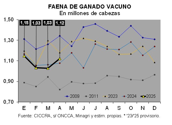 En abril la faena de hacienda vacuna exhibió una recuperación por segundo mes consecutivo. En total se faenaron 1,121 millones de cabezas, lo que arrojó subas de 1,7% mensual y 4,2% anual, corregidas por el número de días laborables. Mientras la faena de abril de 2024 había caído al puesto 22º, la de abril de 2025 ocupó el puesto 15º entre los últimos cuarenta y seis abriles.