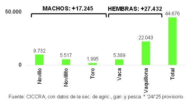 Asimismo, se faenaron 2,028 millones de hembras en el período analizado, lo que arrojó una contracción de 1,2% interanual. Poco menos de dos tercios correspondió a vaquillonas (+7,3% anual) y el resto a vacas (-13,1% anual). Todo esto se tradujo en una menor participación de las hembras en la faena total, equivalente a 46,9%.