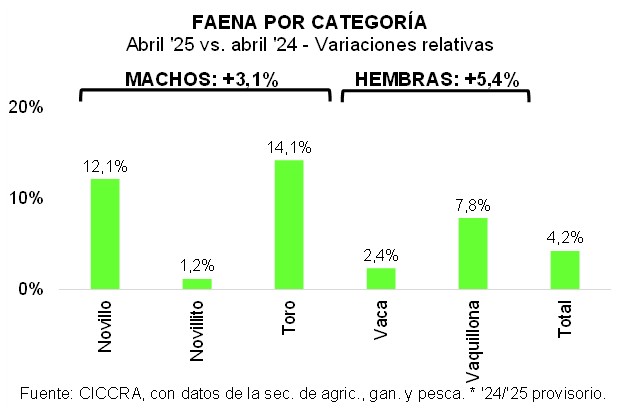 Entre abril de 2024 y abril de 2025 el ritmo de aumento del precio de la hacienda en pie se mantuvo en 56,2%. Todas las categorías registraron subas similares, con un máximo de 58,1% en el caso de los novillos y de 55,7% en el caso de los novillitos. Los toros fueron la excepción, ya que su valor unitario se incrementó ‘sólo’ 47,0% en el último año.