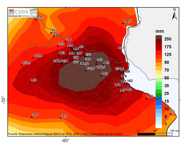 Los partidos más golpeados habrían sido Salto, Rojas, Chivilcoy, Chacabuco, San Antonio de Areco y zonas aledañas. Una franja desde Junín hasta Chacabuco, siguiendo la ruta nacional 7, y hacia el noreste, por la ruta nacional 9 hasta Zárate se encuentra visiblemente afectada.