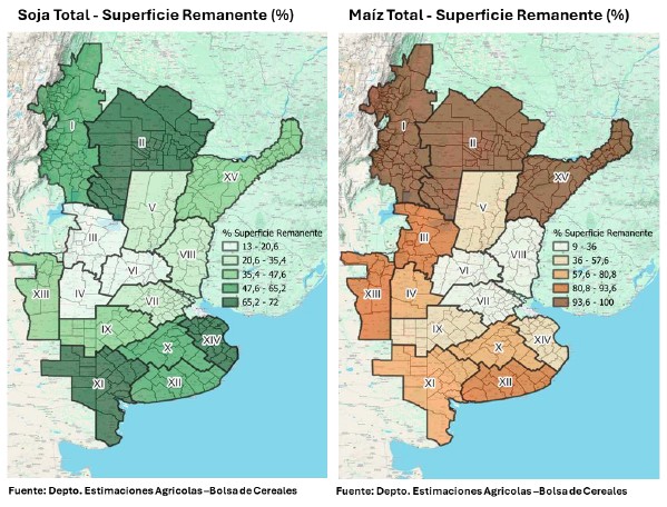 En cuanto al maíz, el avance de cosecha en el norte bonaerense se aproxima al 90 %, conremanentes correspondientes principalmente a planteos tardíos y de segunda ocupación,los cuales abarcan una superficie estimada restante de ser cosechada en 120.000hectáreas. Hacia el oeste bonaerense, si bien todavía resta por cosecharse una mayorsuperficie, no se esperan mermas productivas significativas a nivel regional para estecultivo.