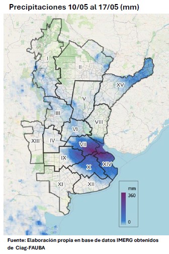 Sin embargo, el evento también tuvo impacto en zonas del oeste bonaerense, como 9 de Julio,que ya había sido afectado previamente por precipitaciones durante el mes de marzo.Desde el punto de vista productivo, aún resta por cosechar una proporción significativa dela superficie sembrada con soja y maíz tardío. La región más comprometida es el nortebonaerense (correspondiente a la zona PAS 7), donde restan por recolectarseaproximadamente 530.000 hectáreas de soja, las cuales podrían presentar algún grado deafectación.