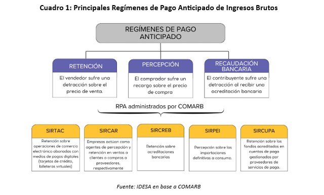 Otra de las grandes distorsiones del impuesto sobre los Ingresos Brutos es que, si bien su cálculo se realiza mensualmente como un porcentaje sobre las ventas, durante el transcurso del mes los contribuyentes están sujetos a múltiples Regímenes de Pago Anticipado (RPA). El impuesto final se calcula restando esos anticipos del monto determinado.