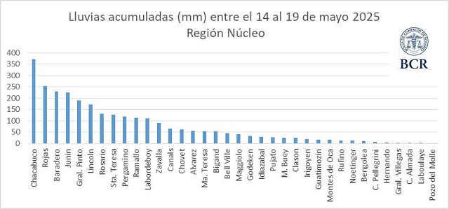 La tormenta de entre el 14 y al 19 de mayo dejó un saldo de 100 a 370 mm en el sudeste de la región núcleo. Las lluvias volvieron a golpear el noreste de Buenos Aires, zona que ya había recibido importantes volúmenes de agua en oportunidades anteriores. Chacabuco totalizó 370 mm en 72 hs, cuadruplicando el valor medio histórico de todo mayo. Rojas acumuló 290 mm, el valor más alto de los últimos 28 años para el mes. Baradero recibió 258 mm, marcando un record de lluvias en mayo de los últimos 19 años. A la fecha, el noreste de la provincia de Buenos Aires ya recibió entre el 70 y el 95% del total de agua de lluvia que acumula en el año.