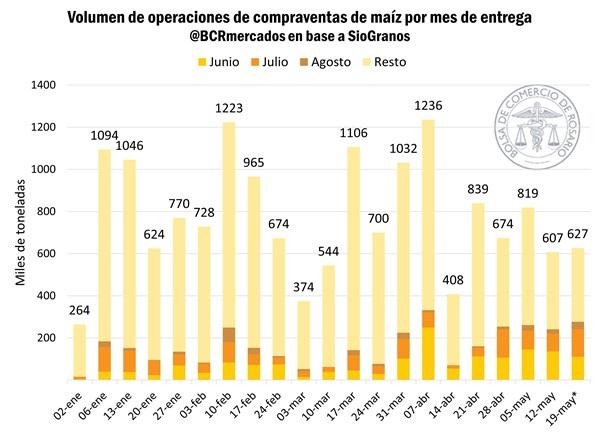 Mientras que en las cuatro semanas que transcurrieron entre la segunda mitad de abril y mediados del corriente mes, la participación promedio de las compraventas con entrega entre los meses de junio y agosto entre el total de los negocios por maíz, con precio hecho y a fijar, registrados en Sio Granos se ubicó en torno al 25%, desde la semana pasada se observó un fuerte incremento en este indicador.
