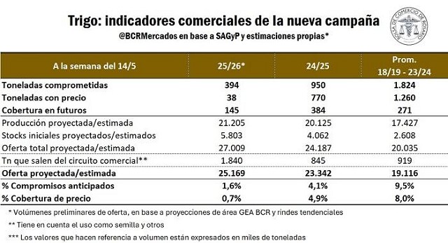 En términos comerciales, los compromisos de trigo nuevo son muy incipientes. Dado lo reciente del anuncio aún no podemos ver su efecto en los datos oficiales de comercialización. Sin embargo, comparado con años previos, a esta altura ya habríamos contado con volúmenes comprometidos mucho más importantes que los actuales.