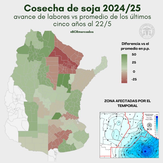 El fuerte temporal que azotó principalmente al norte de la provincia de Buenos Aires podría causar mayores atrasos en una cosecha que finalmente venía tomando ritmo luego de su lento comienzo. Desde principios de mayo, la cosecha de soja a nivel nacional venía avanzando a un ritmo intersemanal de 20 p.p. Al 22/5 y con el temporal de por medio, SAGyP informó que se pudieron abordar 2 Mha más en todo el país para acumular ya el 77% del área objetivo, marcando un avance de 11 p.p. entre semanas.