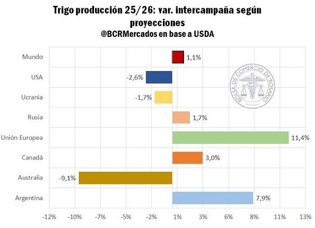 Para esta campaña 2025/26 las primeras proyecciones del departamento de Agricultura de los Estados Unidos (USDA) vaticinan una cosecha récord de 808 Mt (+1,1% interanual) a nivel global, donde lo más resonante es la recuperación de la cosecha francesa. El año pasado, el destiempo climático y las fuertes inundaciones que sufrieron los campos galos antes de comenzar a levantar la cosecha, llevó a que Francia registre su peor campaña desde la década del 80’. Este año, se espera que Europa vuelva a niveles normales de producción, lo que aportaría 7,5 Mt más de trigo para embarcar entre campañas (+28%) desde el continente, más que compensando la menor producción ucraniana y estadounidense.