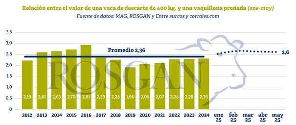 Un indicador que habitualmente se observa es justamente la relación de precios entre una vaca de descarte y un vientre joven preñado. Esto se consigue al contrastar el valor equivalente a una vaca tipo conserva de aproximadamente 400kg contra el valor medio al que se puede conseguir una vaquillona con garantía de preñez.