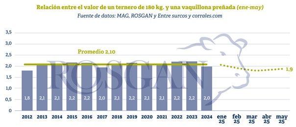 Bajo el mismo cálculo, si analizamos la relación entre el valor de un ternero macho de 180 kg y una vaquillona preñada, vemos que aun siendo mucho más estable que la anterior, dicha relación se ubica este año en uno de los niveles más bajos de la serie (1,9) producto de los muy buenos valores que ofrece la invernada. En este caso, con un ternero ROSGAN mayo en torno a los $3.500 el kilo), la suba promedio que registran los valores en lo que va del año asciende al 24% interanual, superando así la suba que -hasta el momento- registran los vientres.