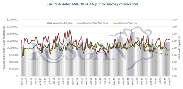 Actualmente, la relación de valores entre una vaquillona preñada ($1.200.000) y una vaca vacía de descarte ($1.100 a $1.200 el kilo) se ubica en torno a 2,6, entre un 10% y un 15% superior a lo registrado en los últimos años.