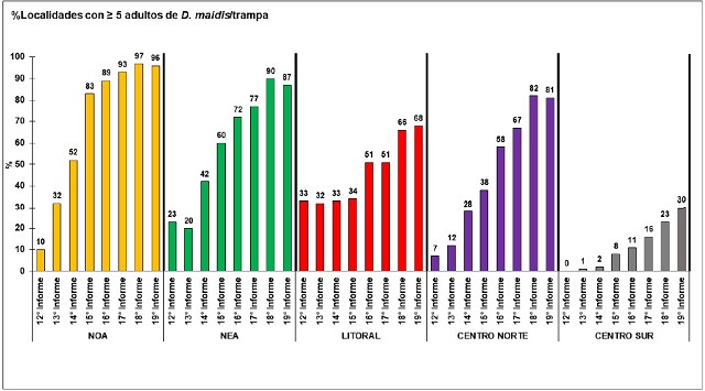 Figura . Evolución del porcentaje de localidades para cada región con cantidades ≥ 5 adultos de Dalbulus maidis/trampas. Se detalla los porcentajes para cada quincena correspondiente a los últimos informes de la Red Nacional de Monitoreo de la chicharrita del maíz (Dalbulus maidis).