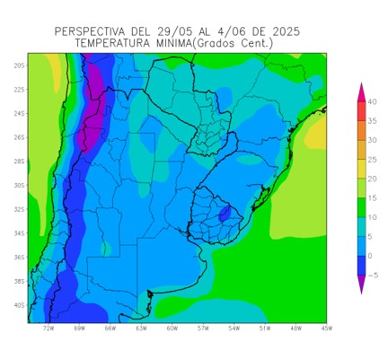 • El centro del NOA, el centro y el este de Cuyo, la mayor parte de la Mesopotamia, la mayor parte de la Región Pampeana y la mayor parte del Uruguay observarán temperaturas mínimas entre 0 y 5 °C, con heladas localizadas, con focos con valores inferiores con heladas generales.