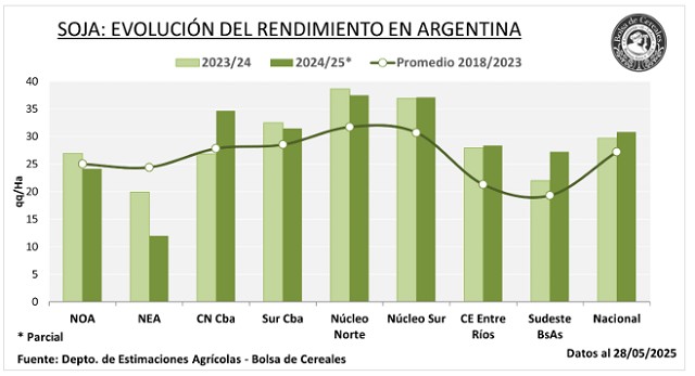 En tanto a la soja, luego de un progreso intersemanal de 6,4 p.p, la cosecha alcanzo el 80,7 % de la superficie apta, aunque sigue con una demora de -5 p.p. respecto a la campaña pasada y de -7 p.p. frente al promedio de las últimas cinco campañas. El rinde medio nacional es de 30,9 qq/Ha, un 4 % superior al ciclo anterior. La soja de primera, con un 86 % cosechado, está próxima a finalizar, restando avanzar en el norte del área agrícola y sur del área agrícola, y algo menor sobre el centro-norte bonaerense, donde las lluvias recientes dificultan el acceso a los lotes. El rendimiento promedio se ubica en 32,35 qq/Ha. Asimismo, la soja de segunda mantiene buenos rindes en Córdoba, Entre Ríos, Norte de La Pampa- - oeste bonaerense y ambos núcleos, aunque persisten anegamientos sobre centro-norte bonaerense, especialmente en Junín y zonas cercanas. Bajo este escenario, se mantiene la proyección de producción en 50 MTn.